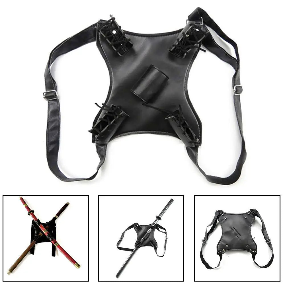 - Stand out with this distinctive leather harness featuring a dual sword belt, perfect for carrying your weapons in style.