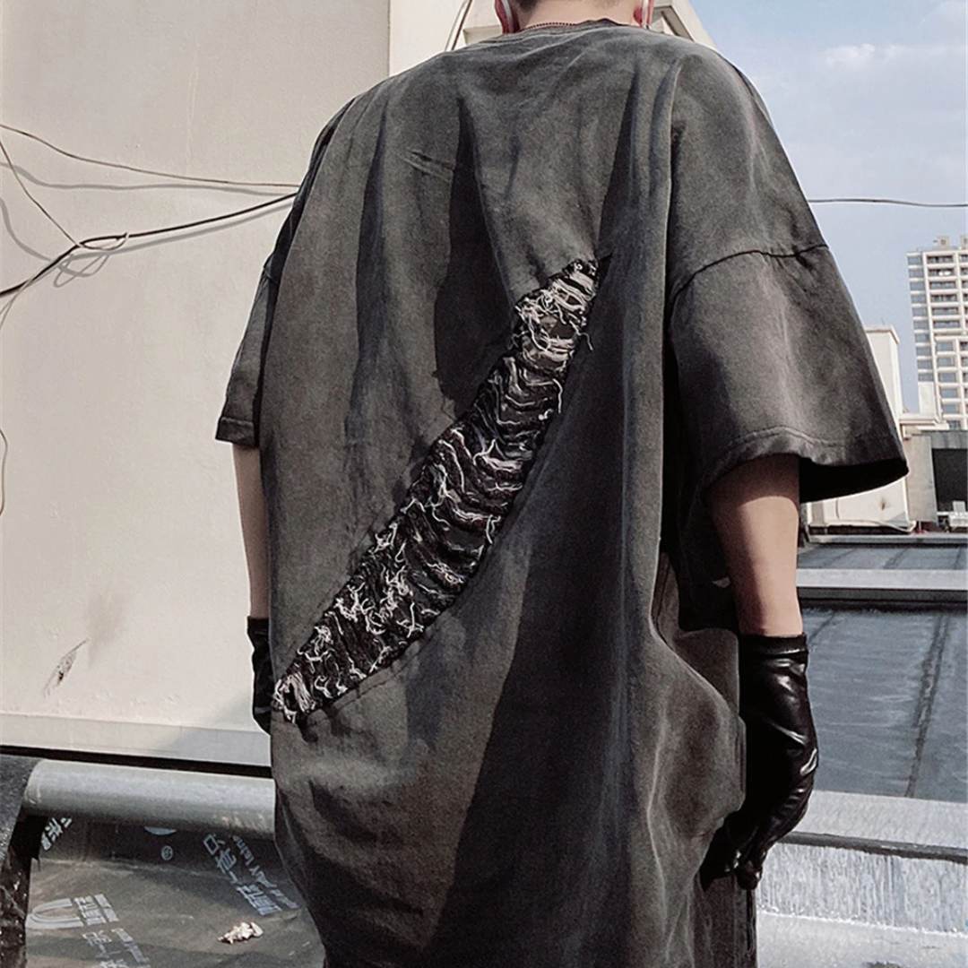 - 🧵 Ripped & Patched Details – Featuring distressed holes and unique patchwork accents, this t-shirt captures a rugged, rebellious style that adds personality to any outfit.